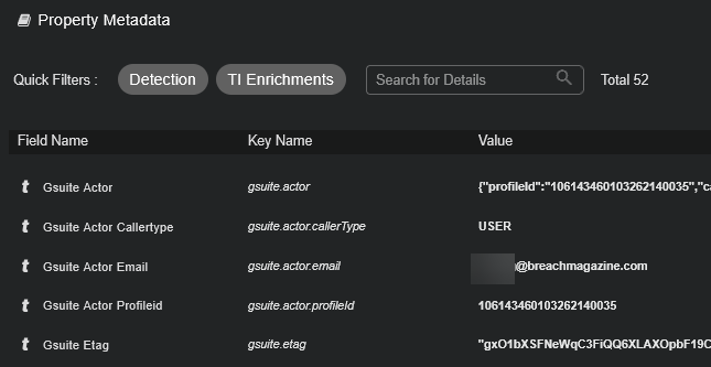 To learn which fields may be useful for your queries, expand the Interflow details in views such as the Threat Hunting Documents table. Locate the vendor name and note the fields. Repeat this with different Interflow rows, since Stellar Cyber does not typically create the fields if the incoming value is blank.