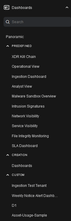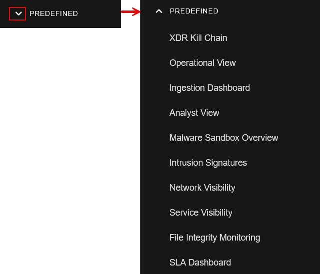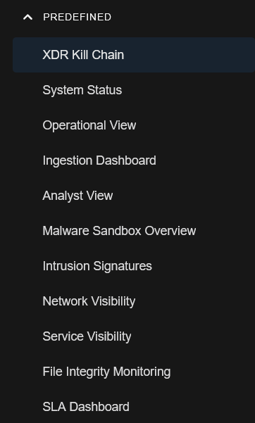 icon to expand the PREDEFINED section of the Dashboards menu to view the menu items: XDR Kill Chain, System Status, Operational View, Ingestion Dashboard, Analyst View, Malware Sandbox Overview, Intrusion Signatures, Network Visibility, Service Visibility, File Integrity Monitoring, and SLA Dashboard.