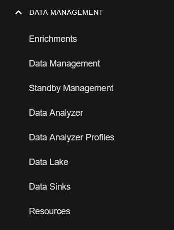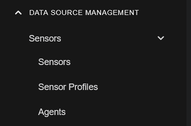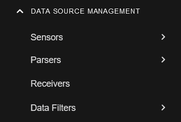 icon to expand the DATA SOURCE MANAGEMENT section of the System menu to view the menu items: Sensors, Parsers, Receivers, and Data Filters.