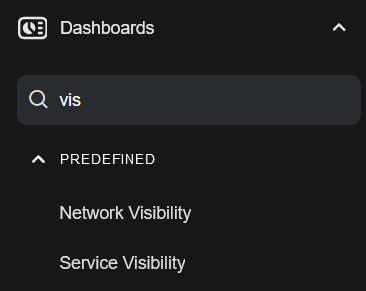 Use the Dashboards Search box to search for menu items within the Dashboards menu. For example, if you search for vis, the search result is as follows.