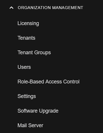icon to expand the ORGANIZATION MANAGEMENT section of the System menu to view the menu items: Licensing, Tenants, Tenant Groups, Users, Role-Based Access Control, Settings, Software Upgrade, and Mail Server.