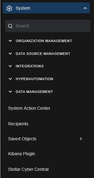In addition, there are a few menu items at the bottom of the System menu: System Action Center, Recipients, Saved Objects, Kibana Plugin, and Stellar Cyber Central.