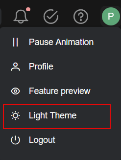 Click the right-most icon to view the menu items: Set/Unset as homepage, Pause Animation, Profile, Feature Preview, Light/Dark Theme, and Logout. In this example, it is a