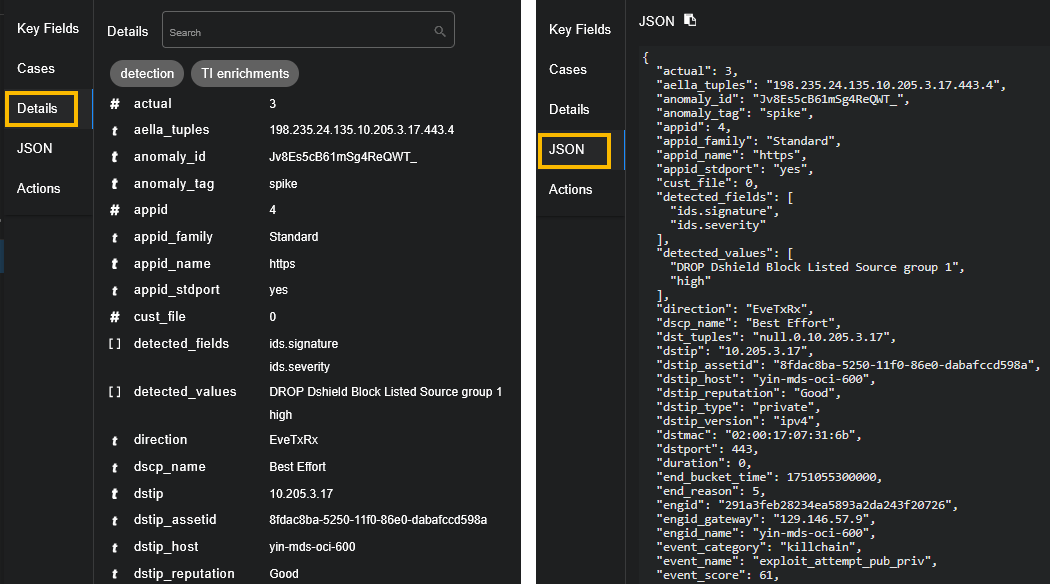 The Event Display component can display the Interflow record in either tabular or raw JSON form. A key purpose of the Interflow record is to provide evidence for an event of interest. The extensible nature of the Interflow record is used by Stellar Cyber to implement its data enhancement and machine learning (ML) functions. The ability to add fields during its life cycle is also used to adapt connectors that contain new definitions. As a result Interflow is future-proofed and able to handle new requirements when needed.