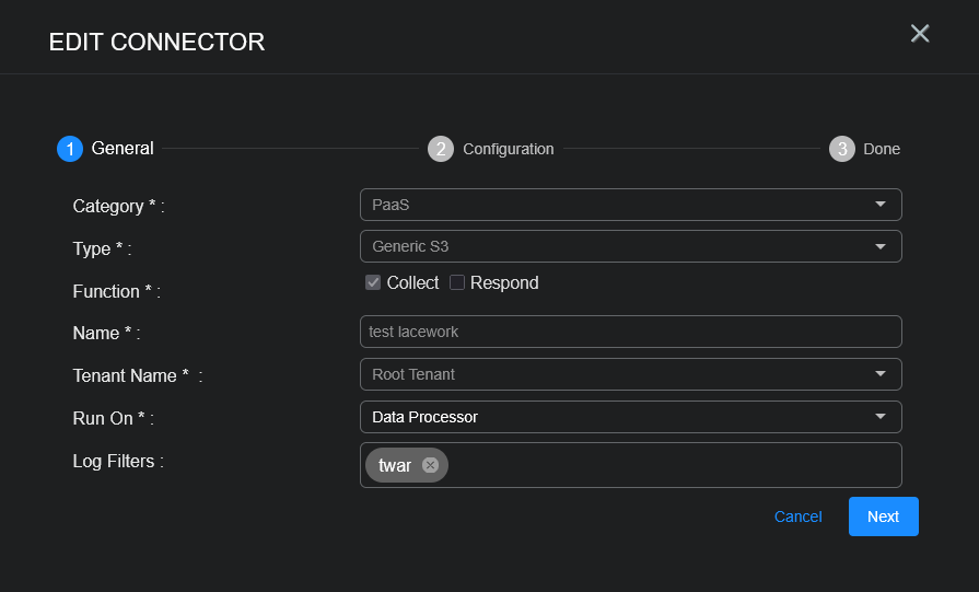 Stellar Cyber conducts a basic connectivity test for the connector and reports a success or failure result. A successful test indicates that you entered all of the connector information correctly.