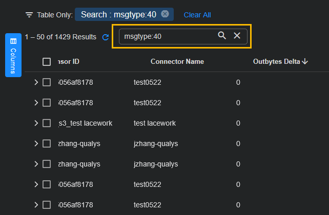 Scroll down to the Document table, enter msgtype:40 in the Search field, and press Enter. This is the msgtype that quantifies ingestion by connector.