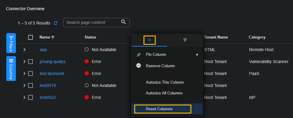 There are several columns in the Connectors table. To see the default columns, click the icon (