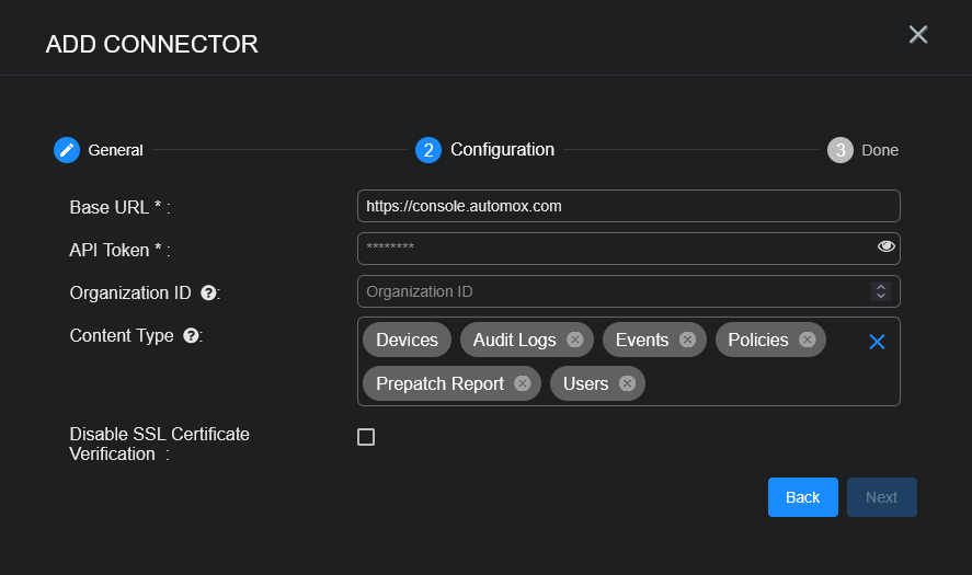 In addition to testing for connectivity, the Test button for the Automox connector tests that the Base URL and API Token are correct and data requests for the requested content types return successful responses.