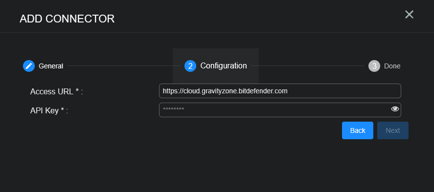• Access URL is the value obtained from your Bitdefender GravityZone Control Center API configuration page.