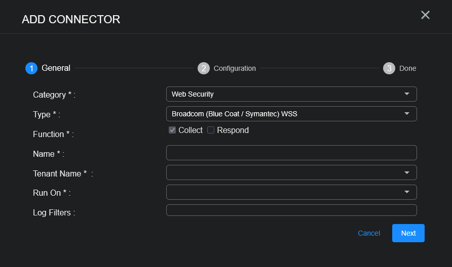 With the configuration information handy, you can add the Broadcom (Blue Coat / Symantec) WSS connector in Stellar Cyber: