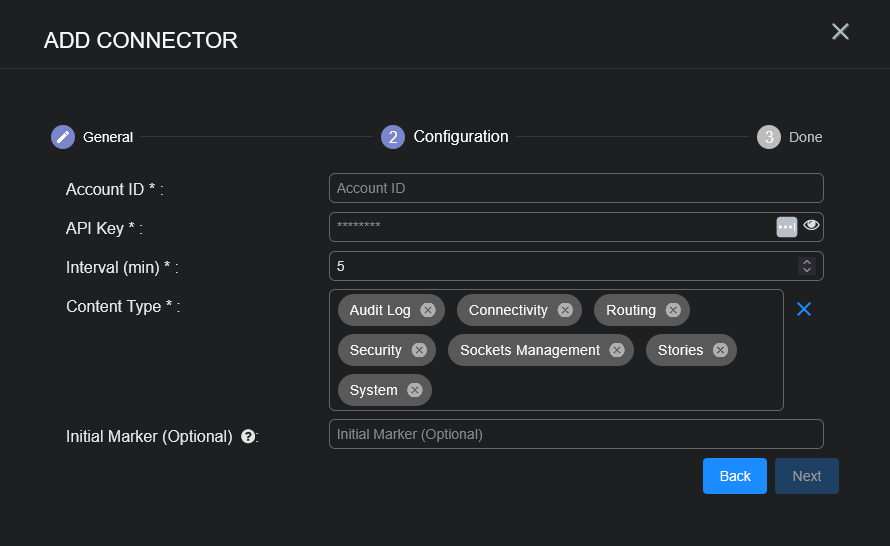 16. (Optional) The Initial Marker field is used to adjust the ingestion start point in cases where the volume of Event data to retrieve is extremely large. (The default duration Cato Network’s API retrieves is 7 days of Event data.) The API supporting this field requires an encoded base64 string (combining topic, partition, and offset) that is unique to your active events queue. Stellar Cyber has provided this field for use only by advanced API users of Cato Networks who are already familiar with retrieving this marker value in their environment. (This marker does not apply to Audit Log data.)