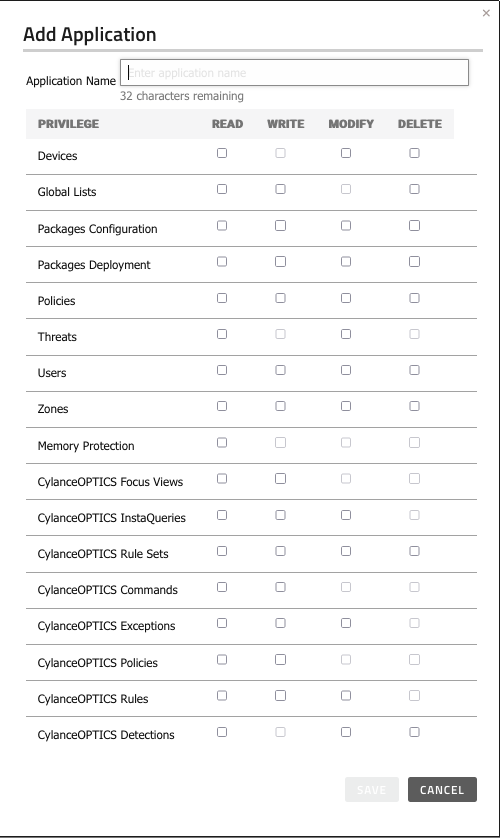 5. Select the access privileges for a Console data type. Not selecting any checkboxes for a data type means the application does not have access to that data type.