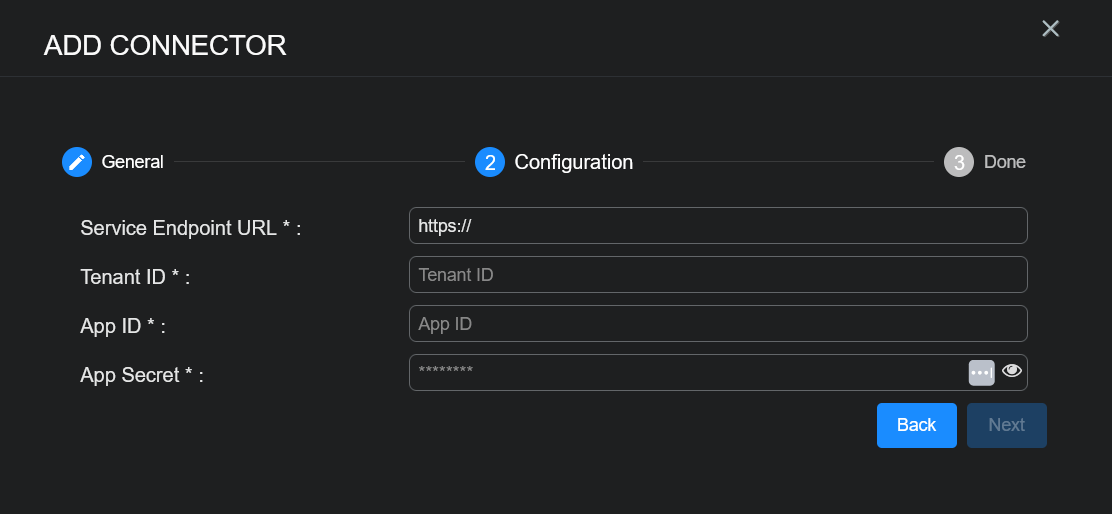 • Service Endpoint URL, Tenant ID, App ID, and App Secret