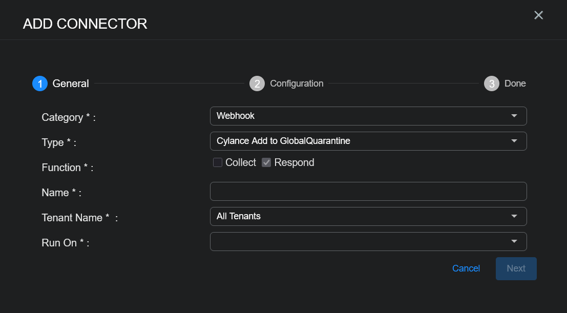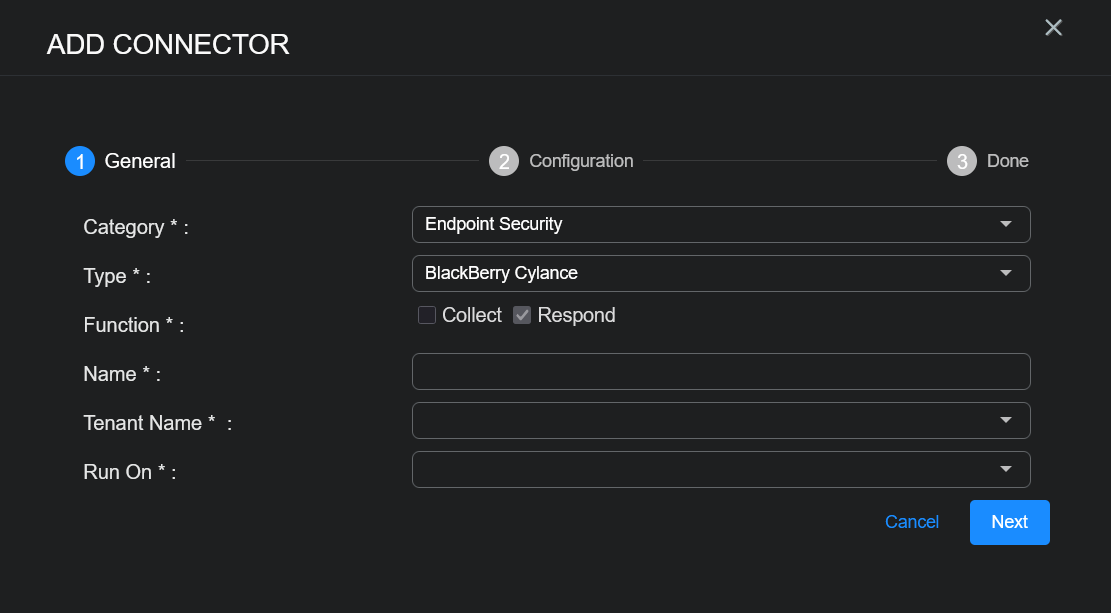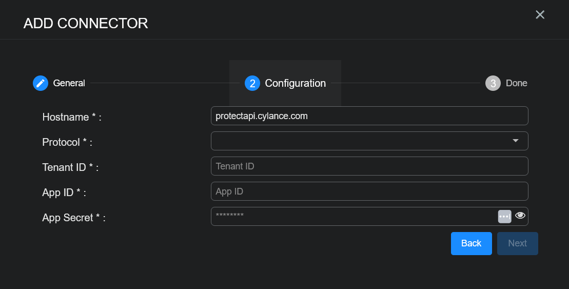 After you have noted the configuration information, you can add the BlackBerry Cylance connector in Stellar Cyber: