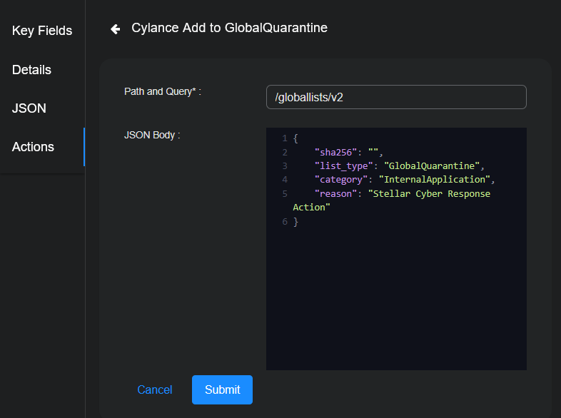 5. Choose one of the predefined templates from the Type dropdown: Cylance Add to GlobalQuarantine, Cylance Add to GlobalSafe, Cylance Delete from GlobalQuarantine, or Cylance Delete from GlobalSafe.