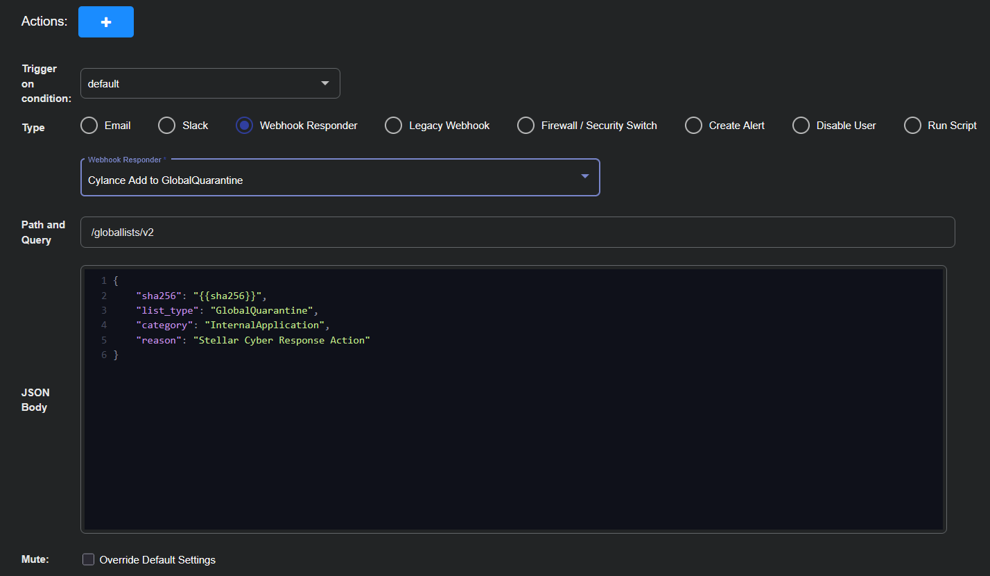 Cylance responders use Webhook templates that support actions. Each action is one responder, there are four actions, and hence there are four Cylance responders: Cylance Add to GlobalQuarantine, Cylance Add to GlobalSafe, Cylance Delete from GlobalQuarantine, and Cylance Delete from GlobalSafe.