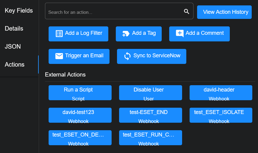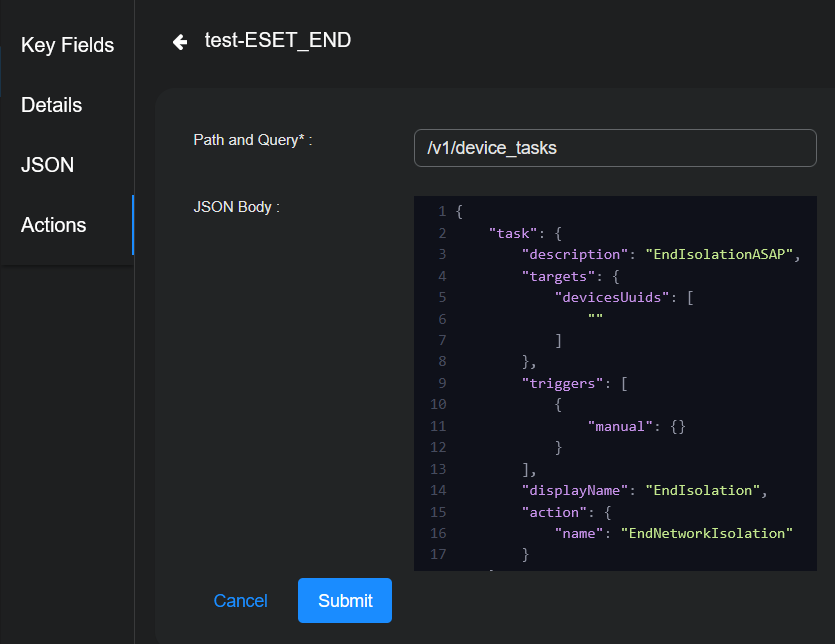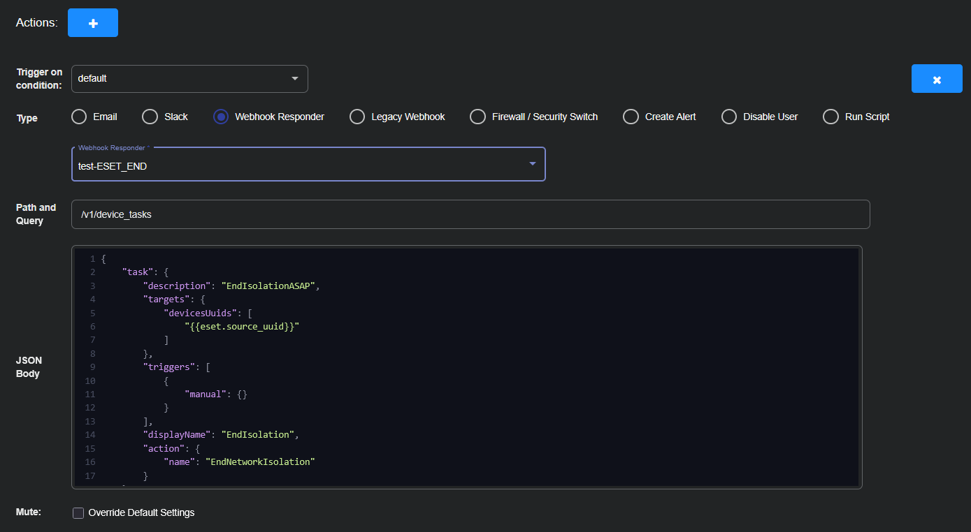 ESET Responders use Webhook templates that support actions. Each action is one responder, there are four actions, and hence there are four ESET Responders: ESET Isolate computer from network, ESET End computer isolation from network, ESET On-Demand Scan, and ESET Run command.