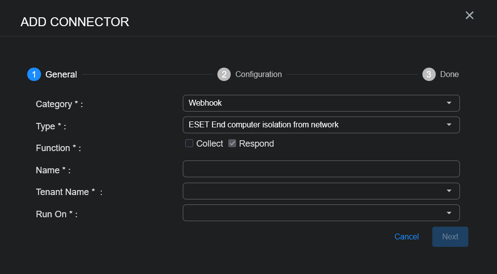 8. Choose a Tenant Name. This identifies which tenant is allowed to use the connector. In addition to specific tenants, this connector supports All Tenants, which means that an ESET Responder can be used across tenants.