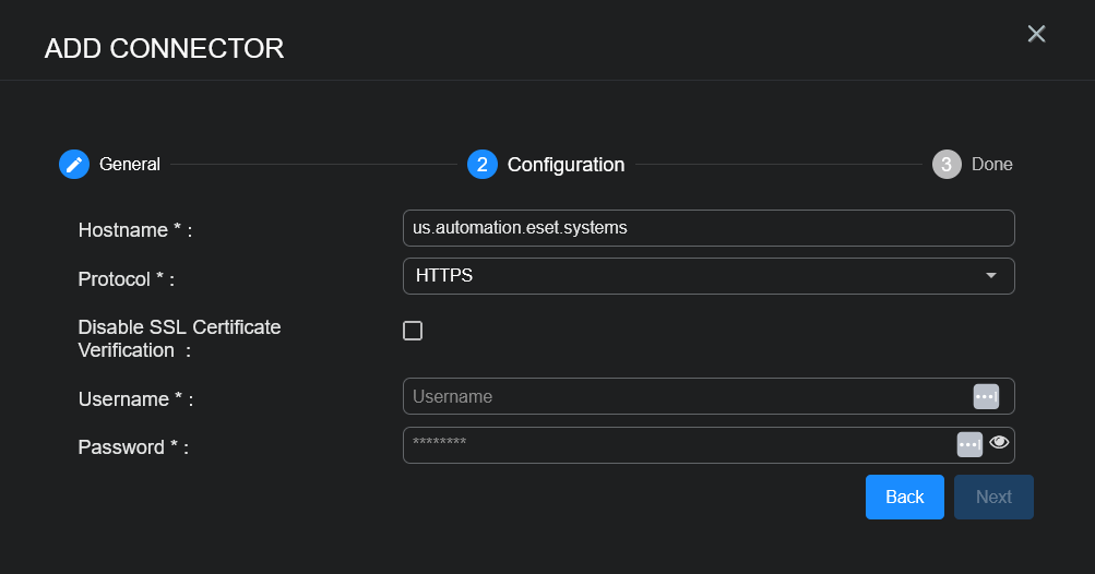 • Username and Password: To obtain a username and password, create an API user account following the guidance in the ESET documentation for Create API User account.