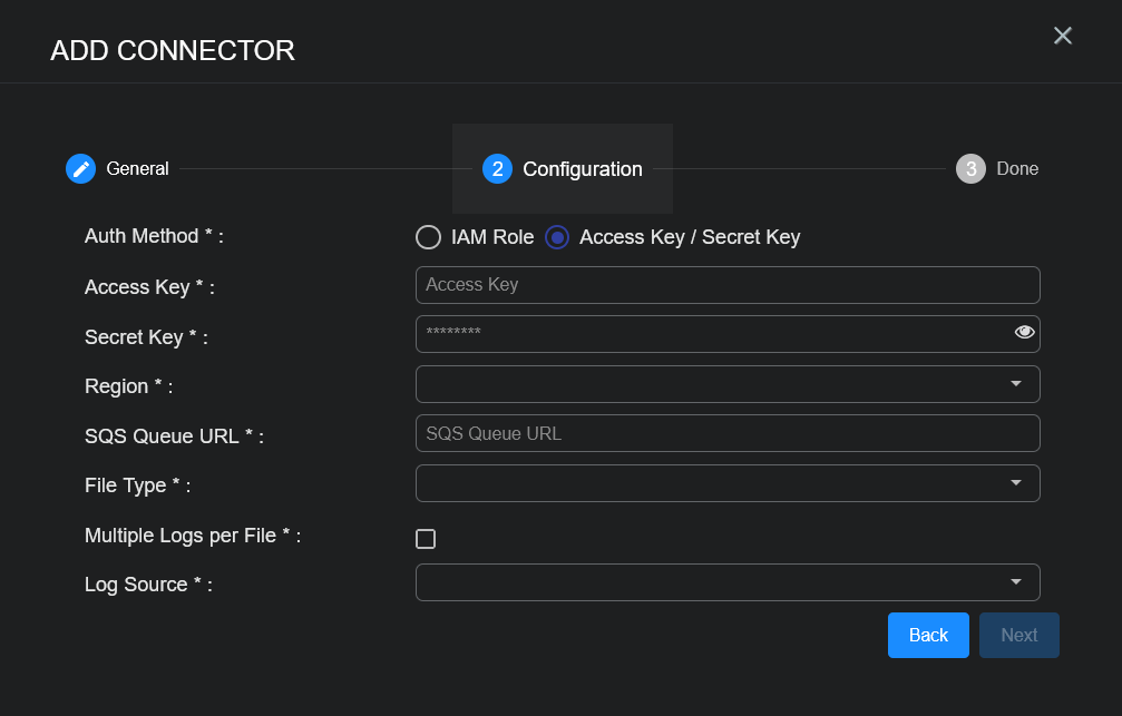 • For Access Key / Secret Key Auth Method: Access Key and Secret Key, plus Region, SQS Queue URL, File Type, and Log Source