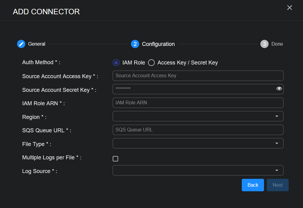 • For IAM Role Auth Method: Source Account Access Key, Source Account Secret Key, and IAM Role ARN, plus Region, SQS Queue URL, File Type, and Log Source