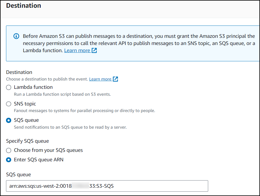 The procedures in this document are for an S3 bucket and SQS queue that are created in the same AWS account.