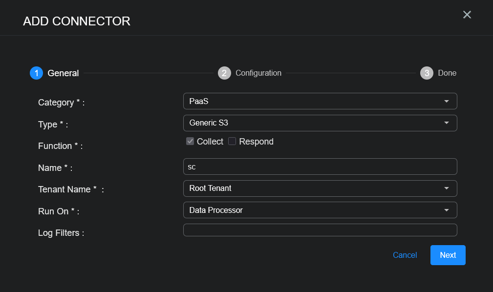 With the access information handy, you can add a Generic S3 connector in Stellar Cyber: