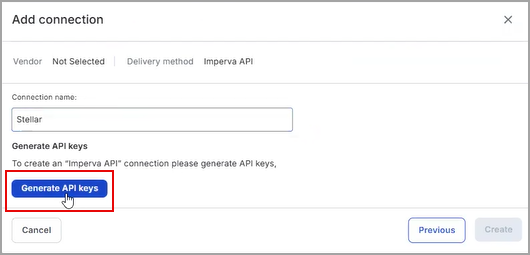 5. In the Add connection page, enter a Connection name and click Generate API keys.