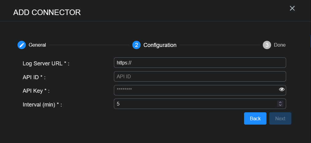 7. Copy the generated API ID, API key, and Log server URL, which will be used to add the connector in Stellar Cyber.