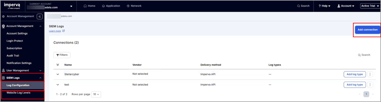 3. Next under SIEM Logs, select Log Configuration. Then click Add Connection.
