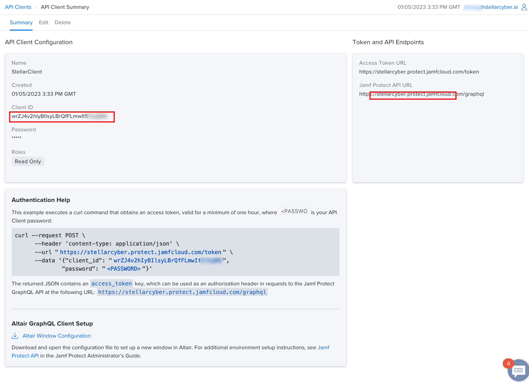 8. After the password dialog closes, the new API client configuration and endpoint information displays. Make note of the Client ID and also the hostname portion of the API URL.