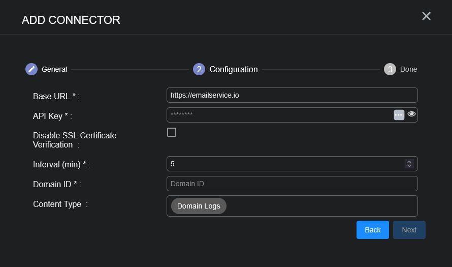 In addition to testing for connectivity, the Test button for the Mailprotector connector tests that the Base URL, API Key, and Domain ID are correct and data requests for the requested content types return successful responses.