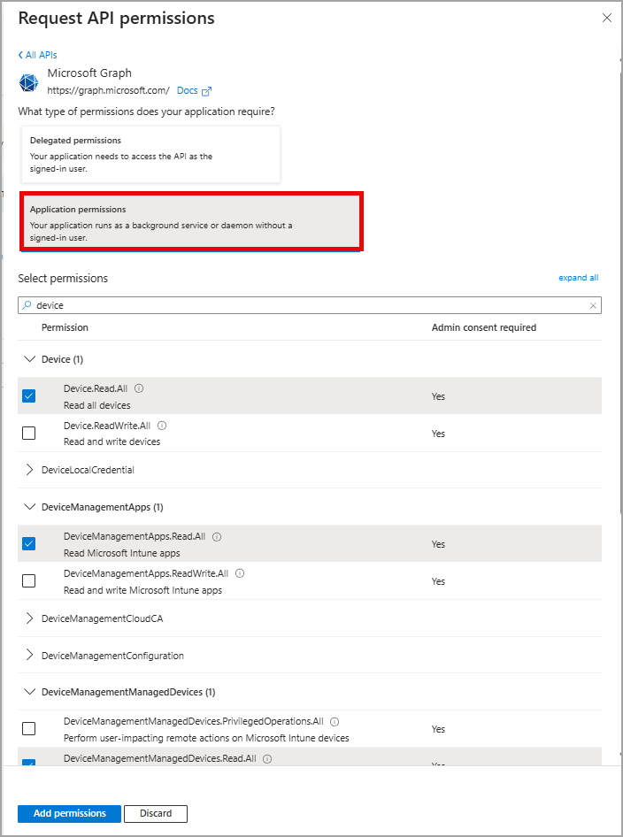 The Microsoft Graph API for Intune requires an active Intune license for the tenant. One of the following permissions is required to call Intune APIs:
