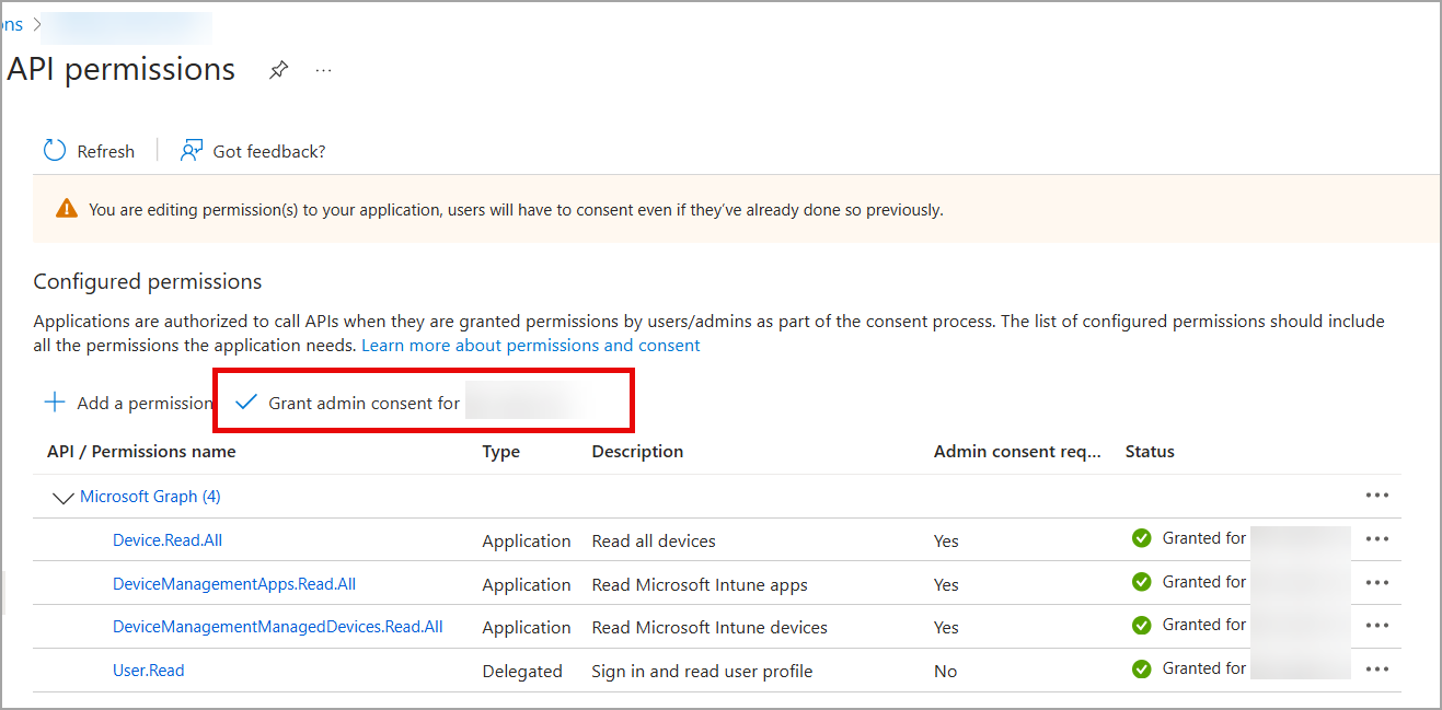 4. If you are the super admin, grant the permissions. Select the checkmark to Grant admin consent for <account name>.