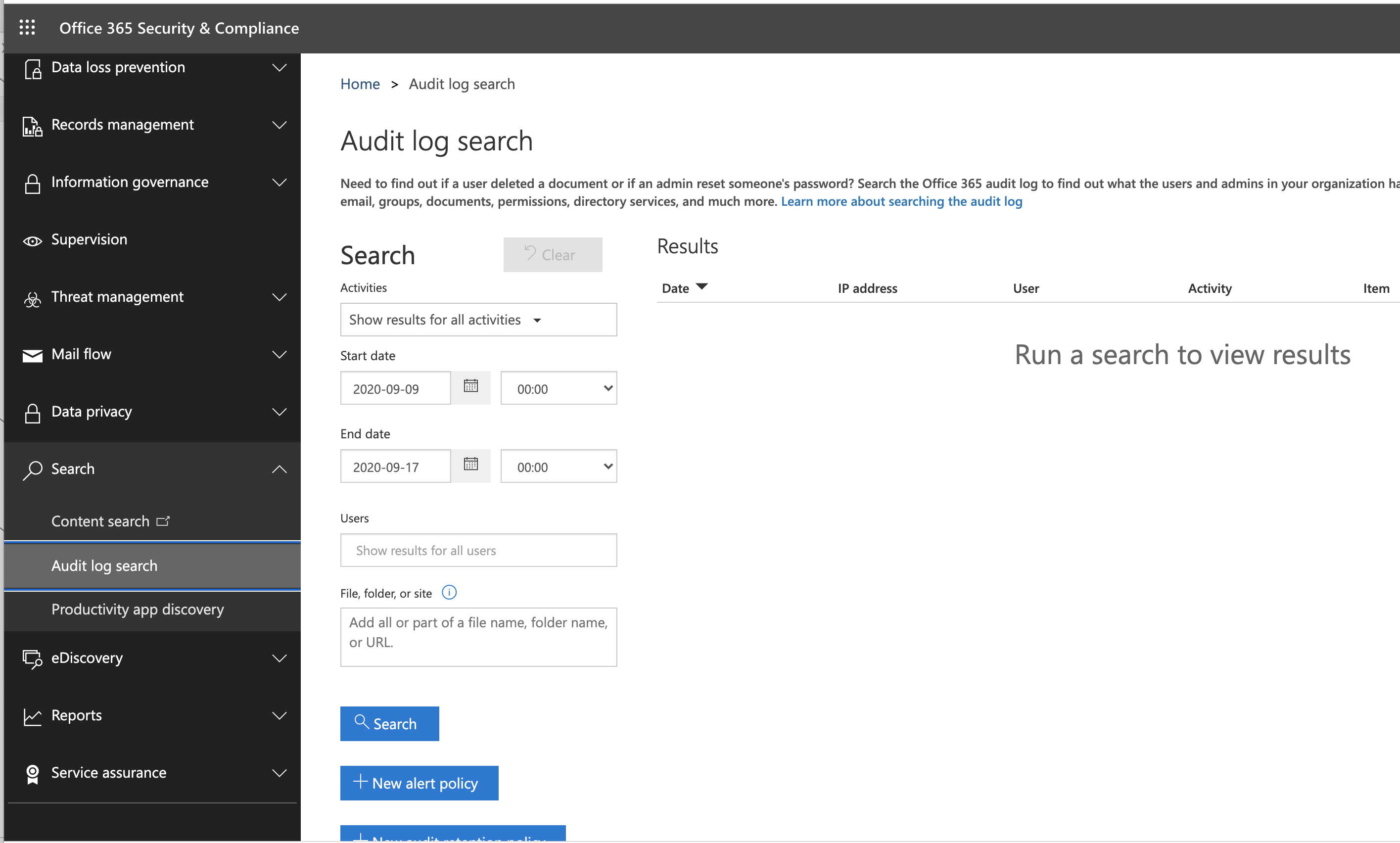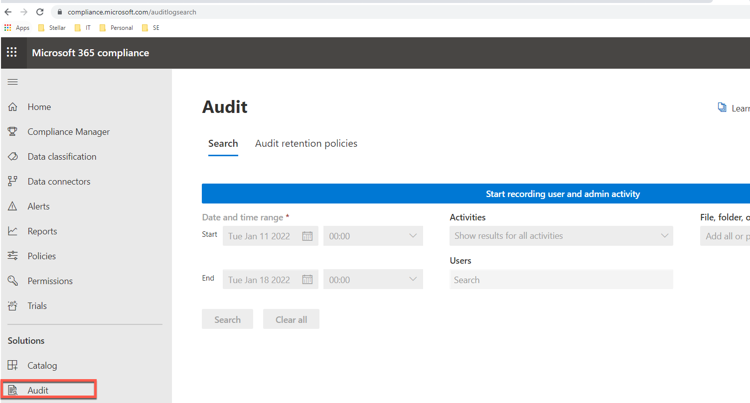 2. In the left navigation pane of the Microsoft 365 compliance center, click Audit.