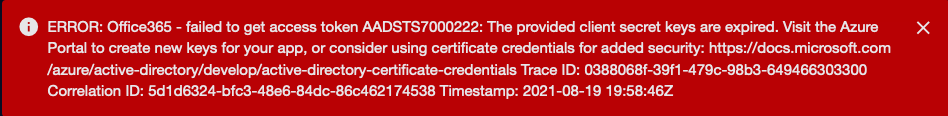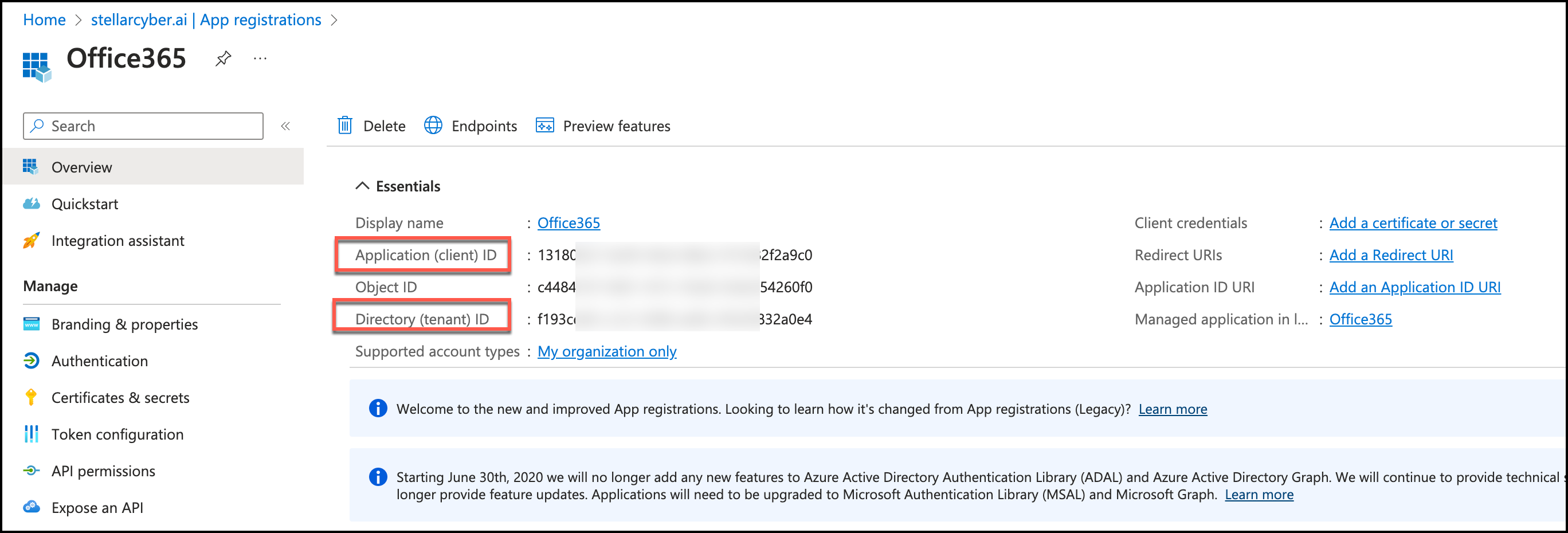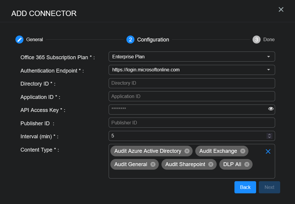 • Office 365 Subscription Plan, Authentication Endpoint, Directory ID, Application ID, and API Access Key