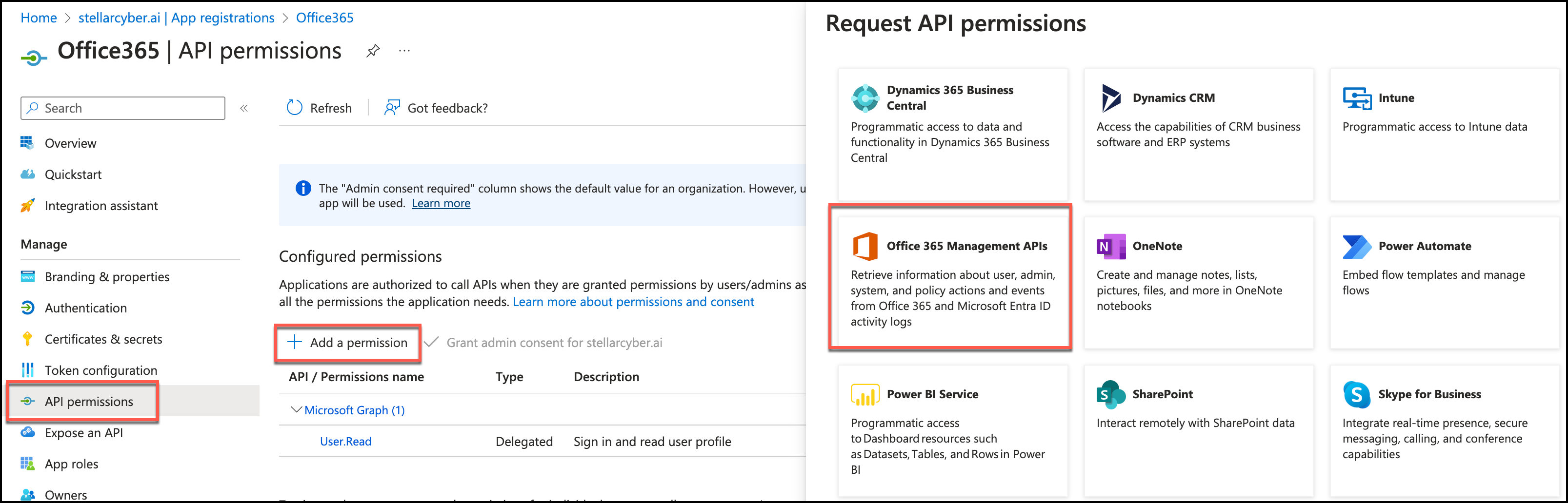 • Microsoft Entra ID App with permissions: ActivityFeed.Read, ActivityFeed.ReadDlp, ServiceHealth.Read