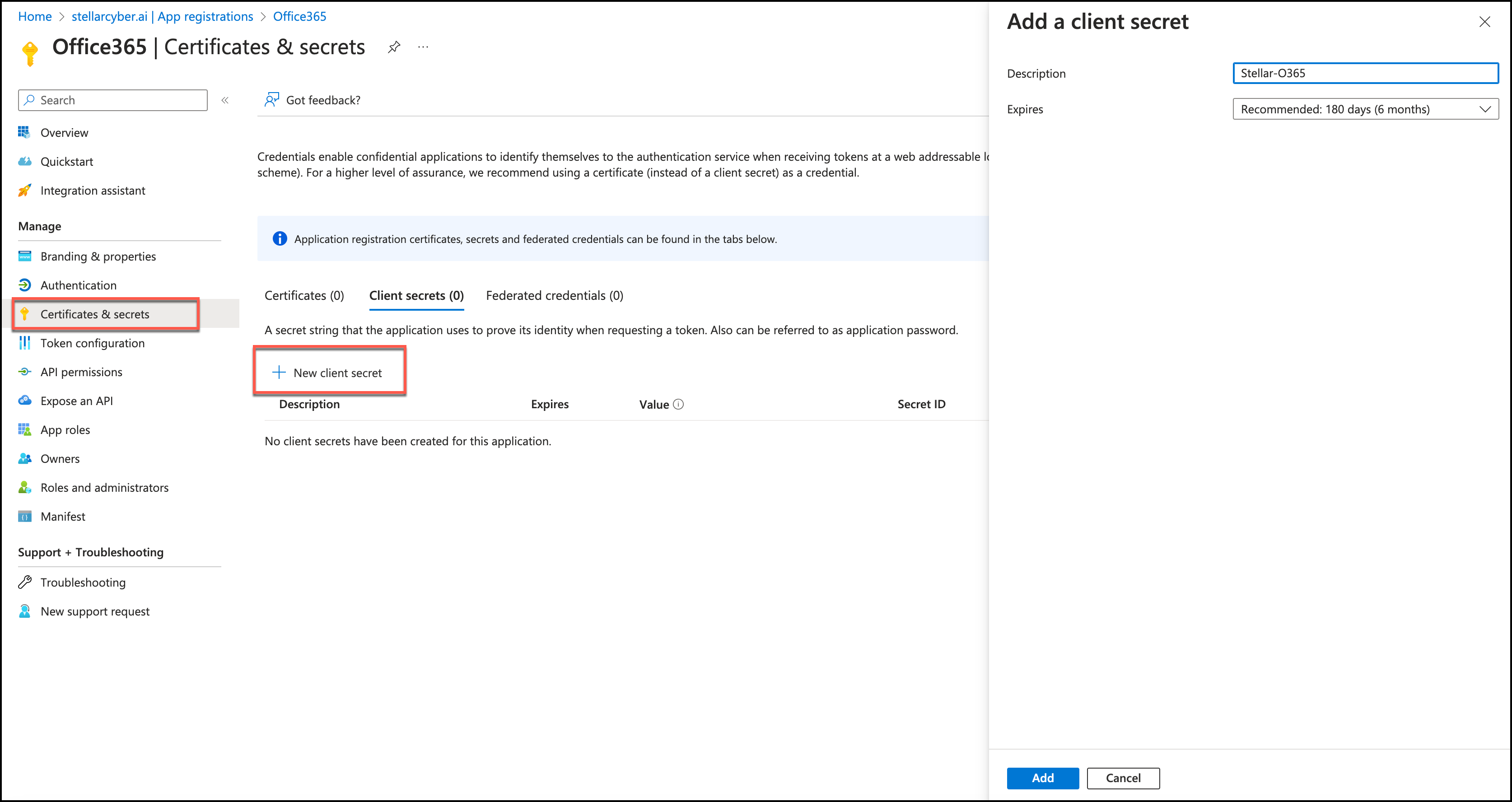 18. In Add a client secret, enter a Description and choose an expiration.