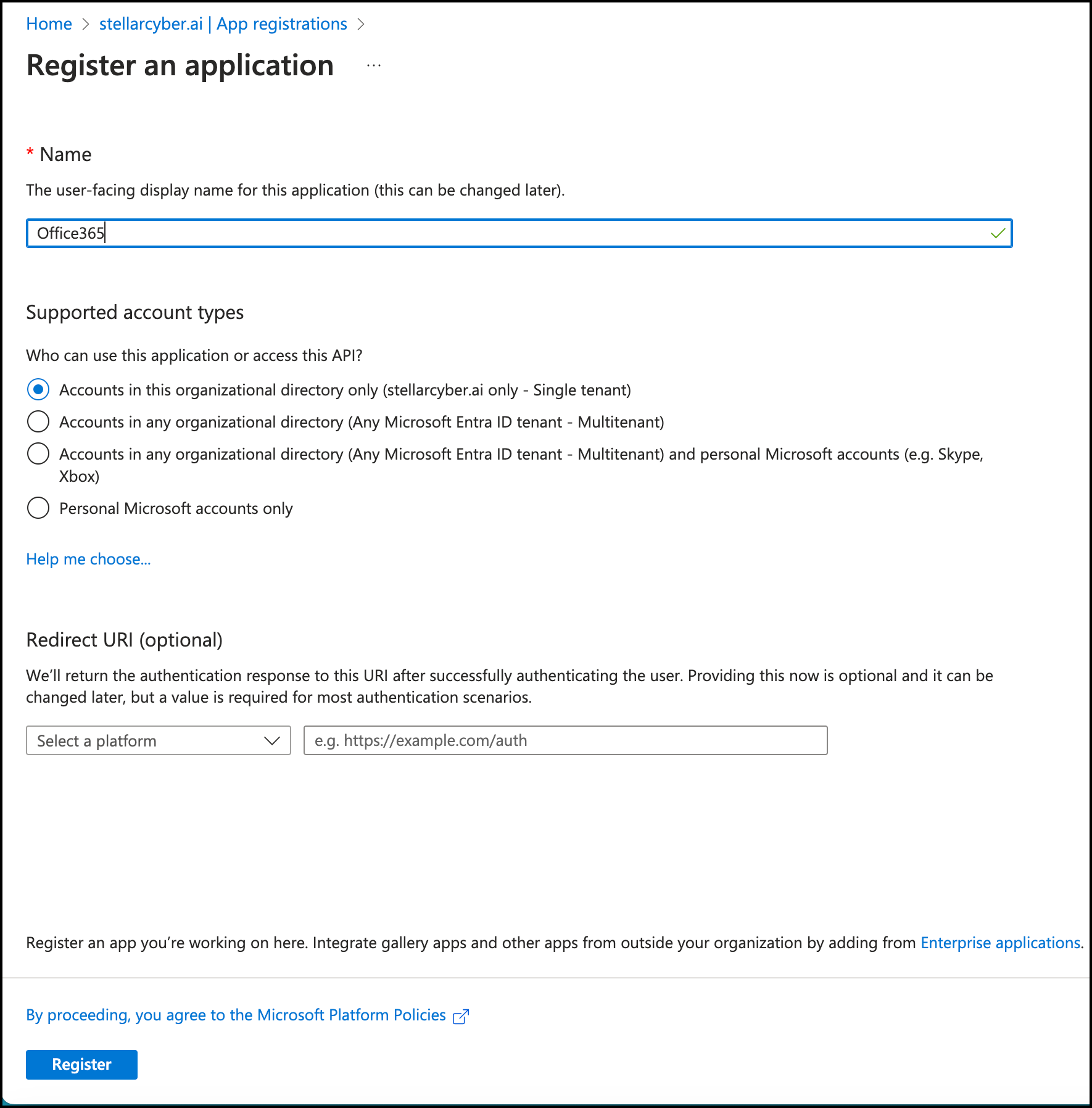 6. Choose a supported account type. Accounts in this organizational directory only is typical.