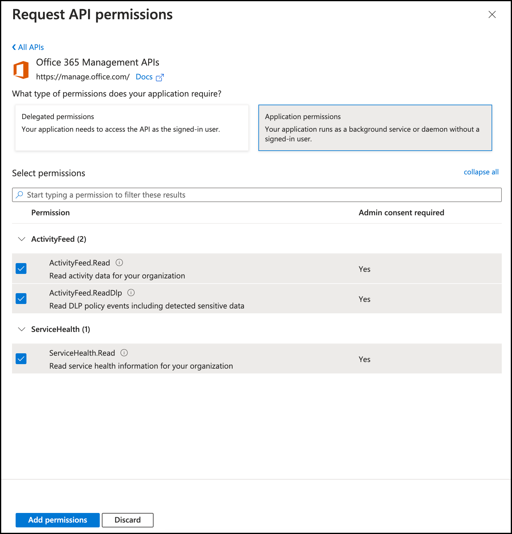 13. Select permissions for ActivityFeed.Read, ActivityFeed.ReadDlp, and ServiceHealth.Read.