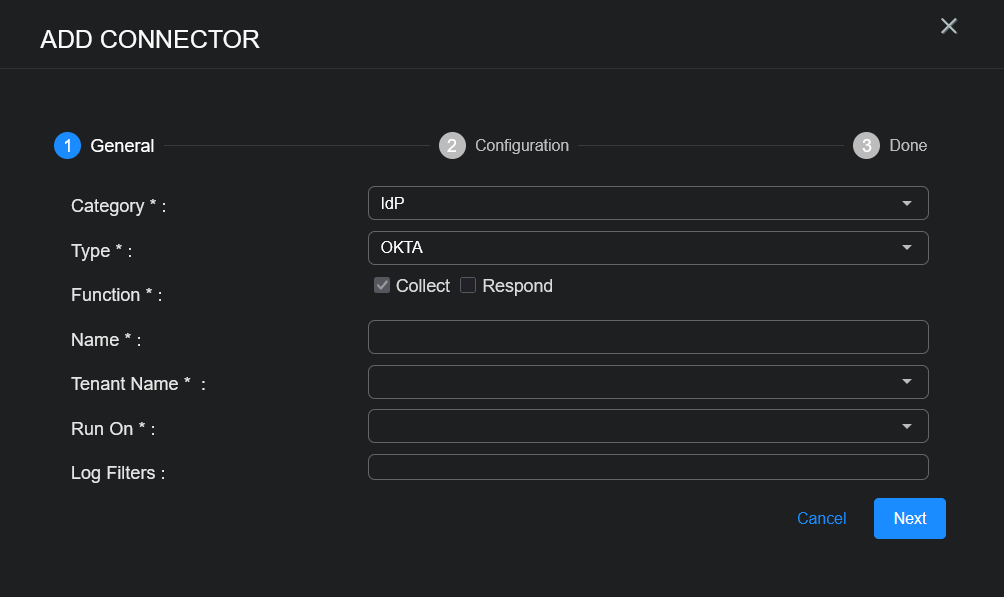 To add an Okta connector in Stellar Cyber: