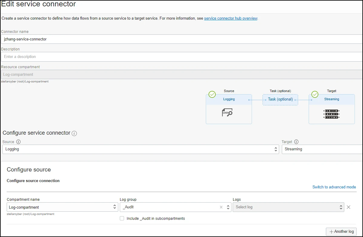 Under Configure service connector, note the Source, which is Logging, and the Target, which is Streaming. They will be used to configure the OCI Streaming connector with a logging source. Refer to the Oracle documentation for Creating a Connector with a Logging Source.