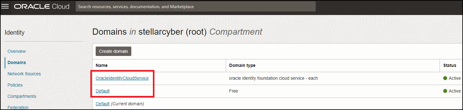 By default, there are two domains in OCI. Select the domain in which you want to create a group and user. In the next step, the example group is created in the Default domain.