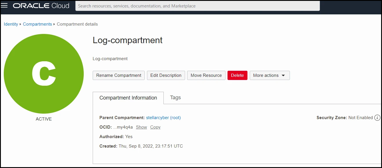 2. Skip this step if you have a compartment already. To create a compartment, refer to the Oracle documentation for Adding Users, search for Create a sandbox compartment, and follow the procedure. In this example, the compartment is Log-compartment.