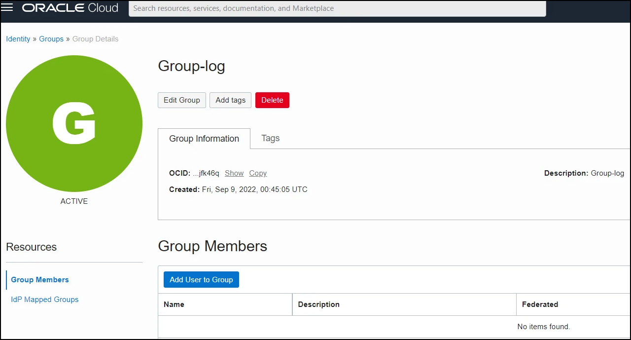 4. To create a group, refer to the Oracle documentation for Adding Users, search for Create a group, and follow the procedure. In this example, the group is Group-log.