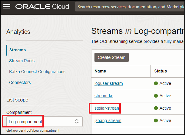 12. Navigate to Streams under Analytics and locate the stream's Stream Pool. In this example, the stream name is loguser-stream and the stream pool is the DefaultPool. The compartment is Log-compartment.