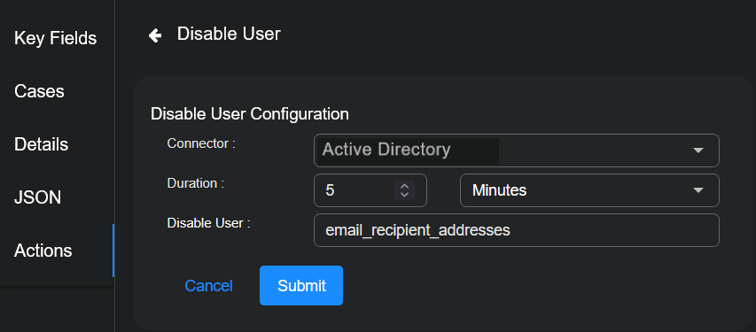 3. Configure the Disable User action as described in External Actions: Disable User. In the Disable User field, enter email.recipient.addresses.
