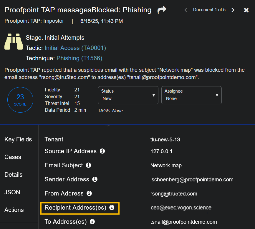 Stellar Cyber maps Proofpoint TAP alerts. The alerts are read from the Syslog Index, enriched with Stellar Cyber fields, and mapped (with deduplication) to the Alerts Index.