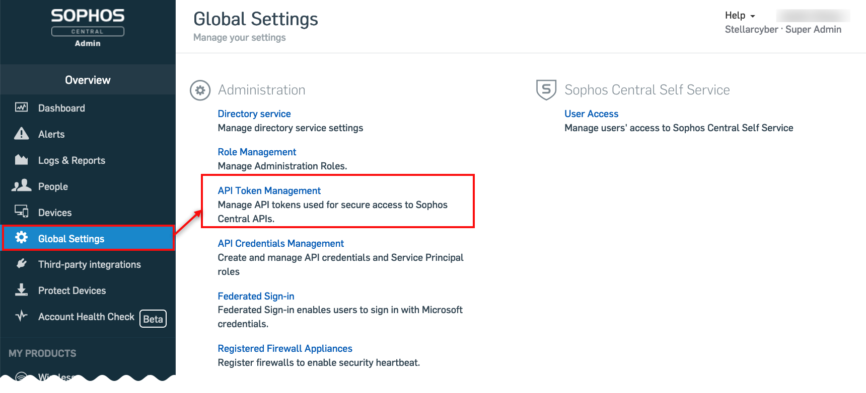 1. Login to Sophos Central Website (https://central.sophos.com) as the user you want to associate with your Stellar Cyber connector.