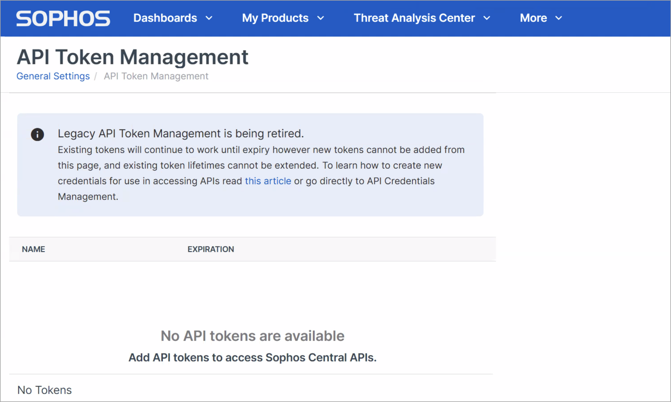 Before you create a Sophos Connector, you must create a Token and get the key values.